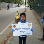 Picked up more than 10 sacks and dumped in in a BBMP garbage collection lorry. We used sacks for collecting and no plastic materials were used. The volunteers visited shops where the surroundings were kept clean and distributed certificate of cleanliness. Placards displaying “Swatchata se Divyata tak” messages in Kannada were displayed by all while doing service.